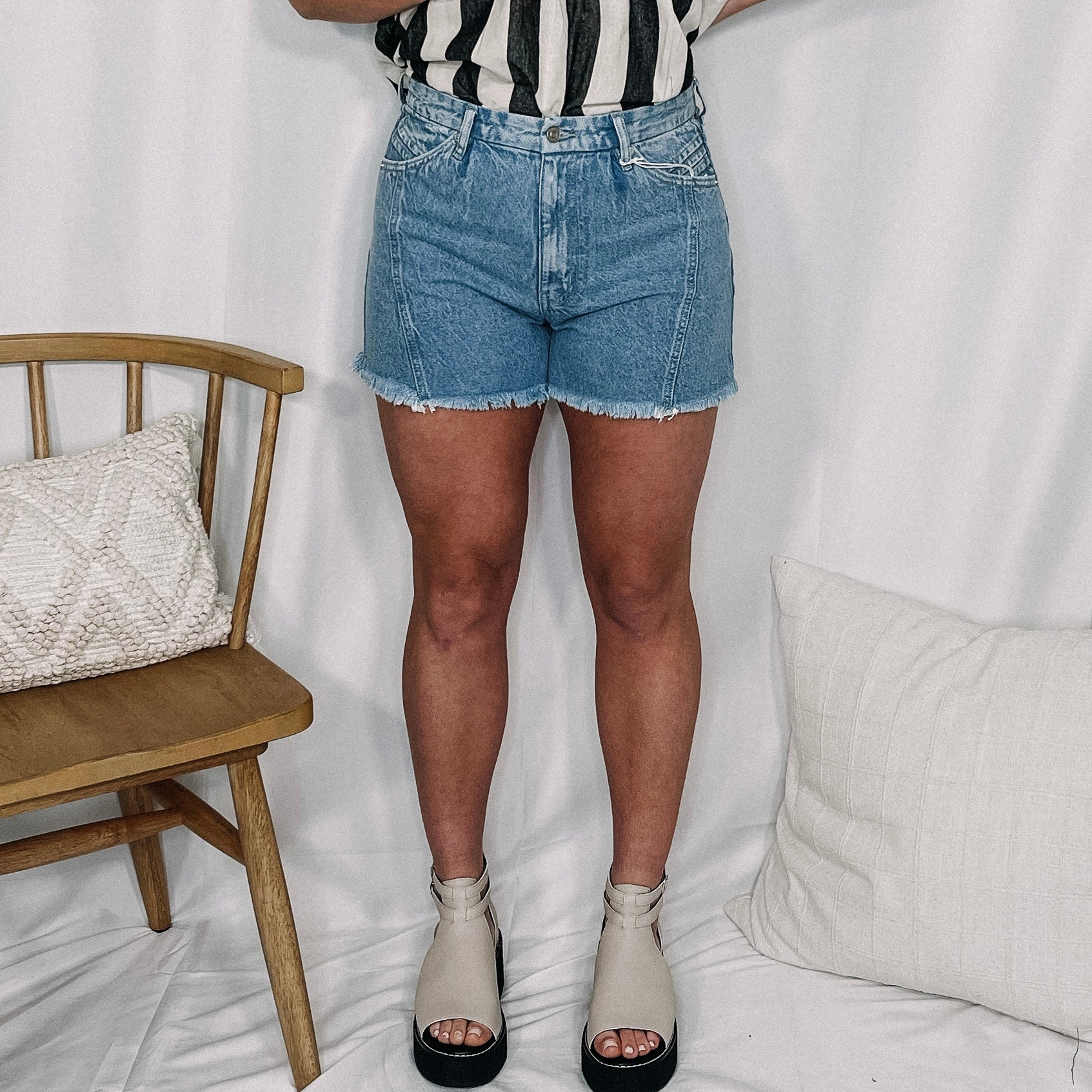 Medium wash shorts from Kan Can that are high waist, have a single button closure and zip fly, has a front seam and a double inseam at the pockets, and has a frayed hem.