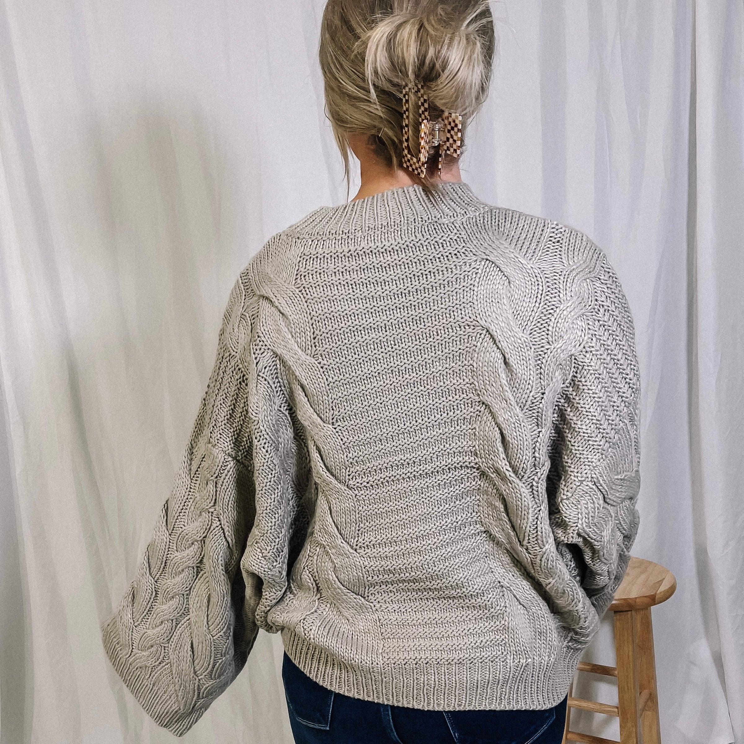 Light grey cable knit sweater with an oversized fit, bell sleeves, and a crew neckline.